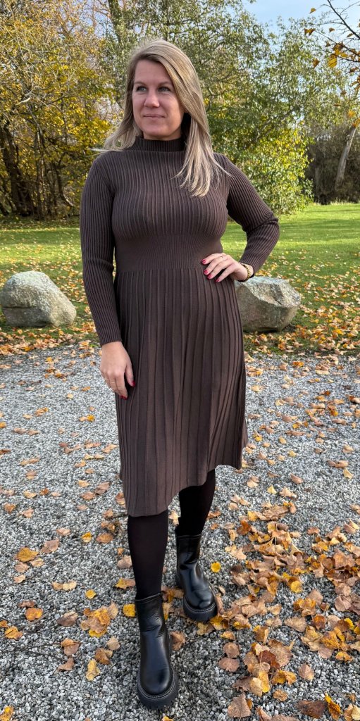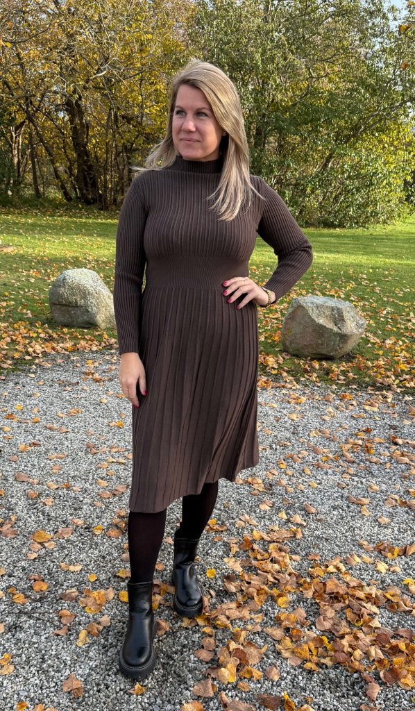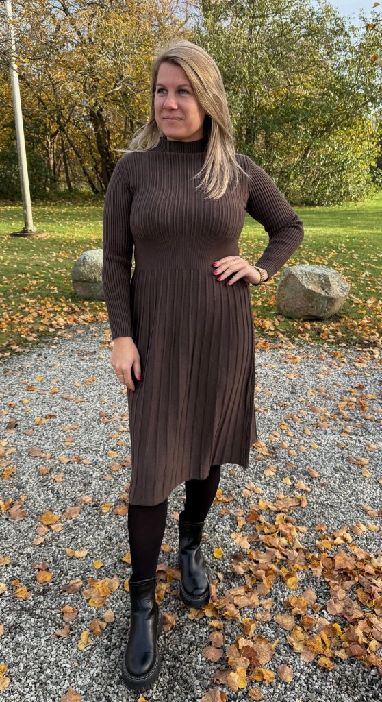 Klänningen har olika stickningar som gör den figursydd upptill med vidd nedtill.